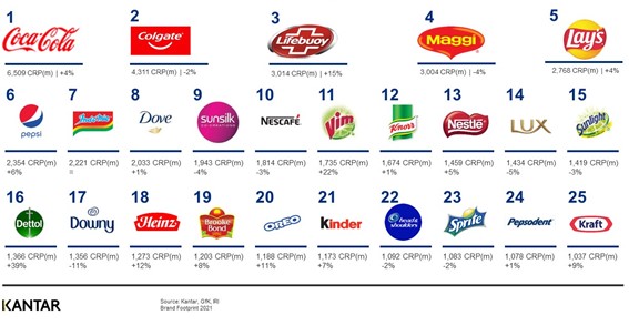 A lista com as 25 maiores marcas inclui também, por ordem, Lays, Pepsi, IndoMie, Dove, Sunsilk (Seda), Nescafé, Vim, Knorr, Nestlé, Lux, Sunlight, Dettol, Downy, Heinz, Brooke Bond, Oreo, Kinder, Head & Shoulders, Sprite, Pepsodent e Kraft.