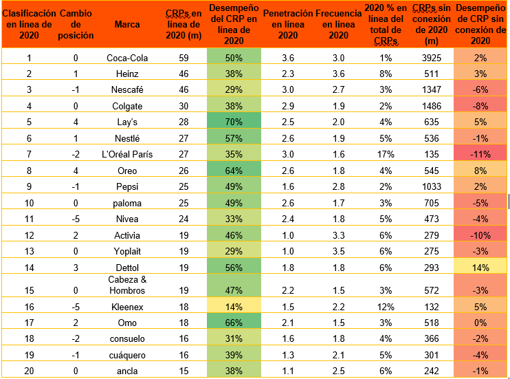 Conforme identificado no relatório Winning Omnichannel da Kantar, a pandemia acelerou a migração de compras presenciais para o online, como alimentos, o que aumentou suas vendas digitais em 45,5%. Como resultado, os compradores se voltaram para as maiores marcas online. As 5 principais marcas escolhidas online foram Coca-Cola, Heinz, Nescafé, Colgate e Lay's. L'Oréal Paris foi a marca da online de maior sucesso, com 17% de suas vendas por meio desse meio eletrônico; seu crescimento online de 35% compensou parcialmente seu declínio offline.