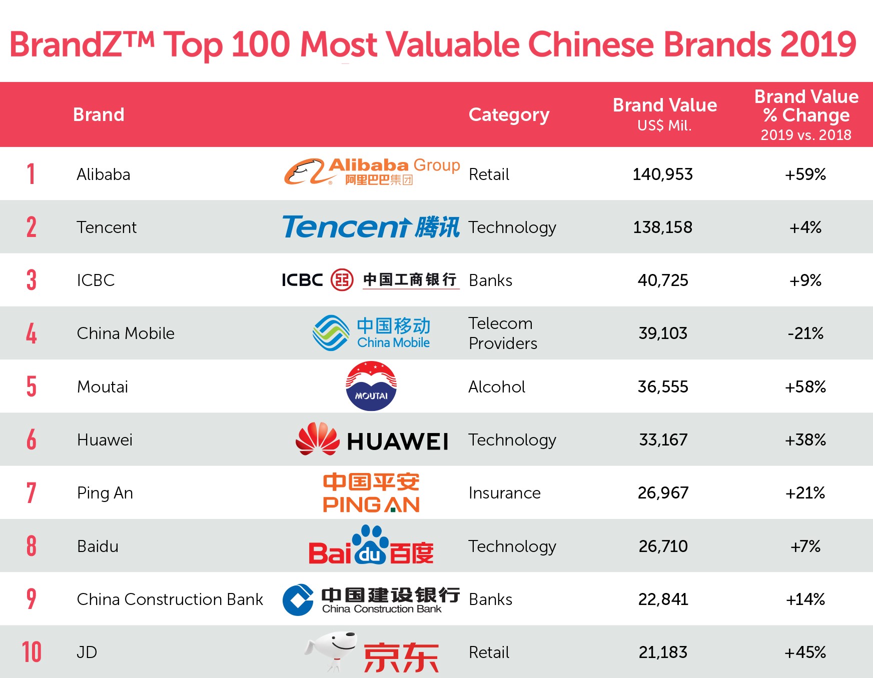 Despite China’s slower economic growth and international trade tensions, the total value of the BrandZ™ Top 100 Most Valuable Chinese Brands increased 30% to US$889.7 billion, the highest annual rise since the ranking launched in the year 2011. The growth has been fuelled by brands accelerating their expansion into China’s lower tier cities, which have seen rapid development and rising consumer buying power, and increasingly positive attitudes to Chinese consumer brands with a global presence.