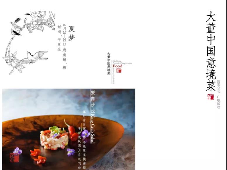 China Da Dong, a Chinese fine dining restaurant, provides poetic descriptions for its artistic conception cuisine courses, claiming that it is a fusion of great dishes from all cross China as well as influenced by Chinese art, Western art and Zen aesthetics.
