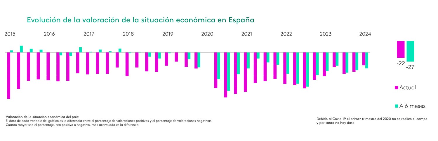 Más negativa es la visión de la economía española, sobre todo si tenemos en cuenta la diferencia entre la valoración actual y a seis meses. En el pasado el consumidor era más optimista respecto al corto plazo y solíamos ver valoraciones a 6 meses mejores que la del momento presente. Pero desde el año 2022, coincidiendo con datos máximos de inflación de las últimas décadas, este optimismo se diluye y ambas valoraciones, la de ahora y la hecha a futuro, se muestran muy similares.