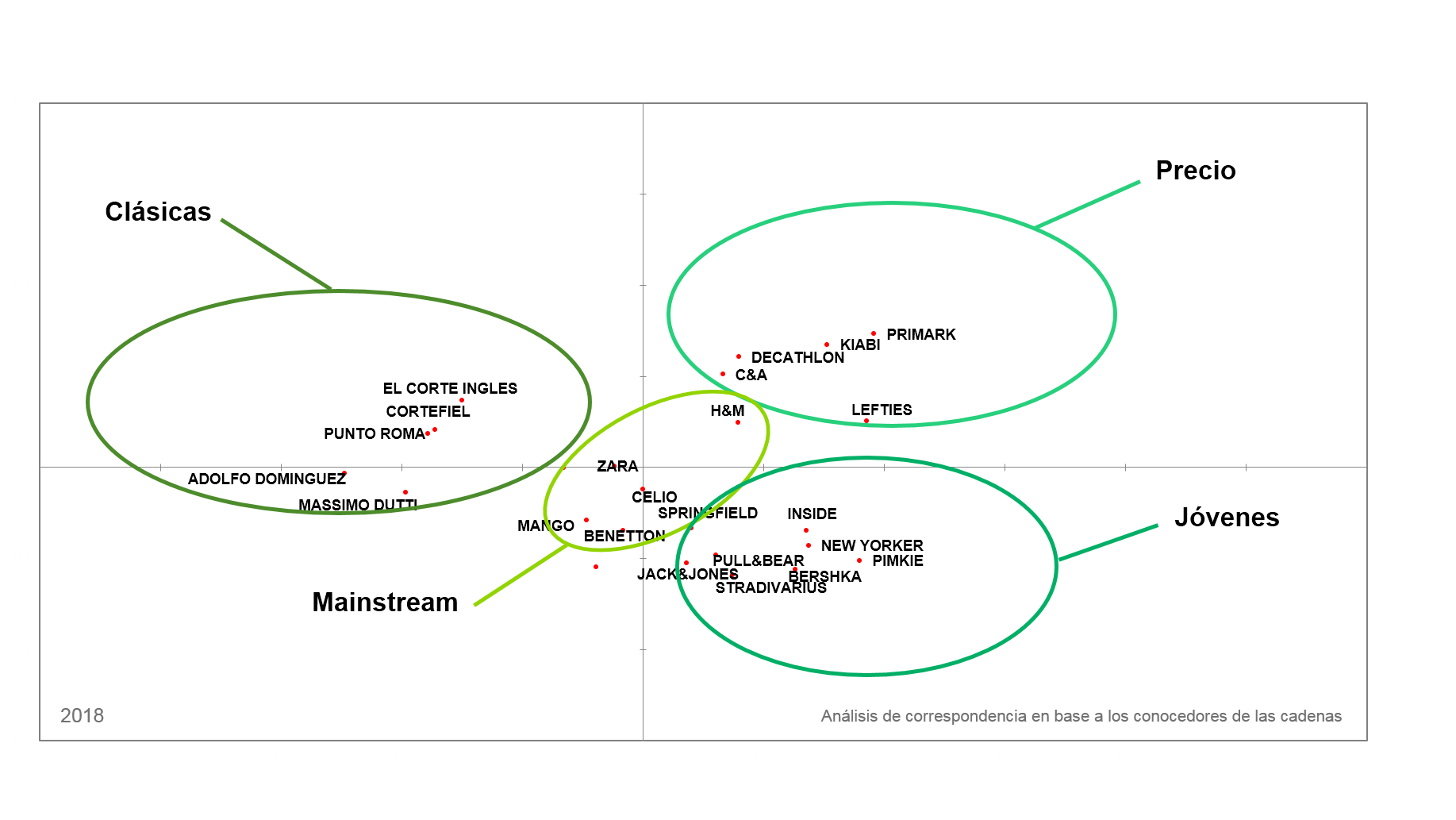 Los compradores de cadenas de moda en España diferencian cuatro grandes tipologías de cadenas, en función de los ítems de imagen que asocian a cada una de ellas. Estos grupos conforman un ecosistema de competencia, en el que se establecen distintas relaciones entre las cadenas y los atributos de imagen que el consumidor percibe de las mismas. La definición de cada grupo está caracterizada por atributos muy distintos: