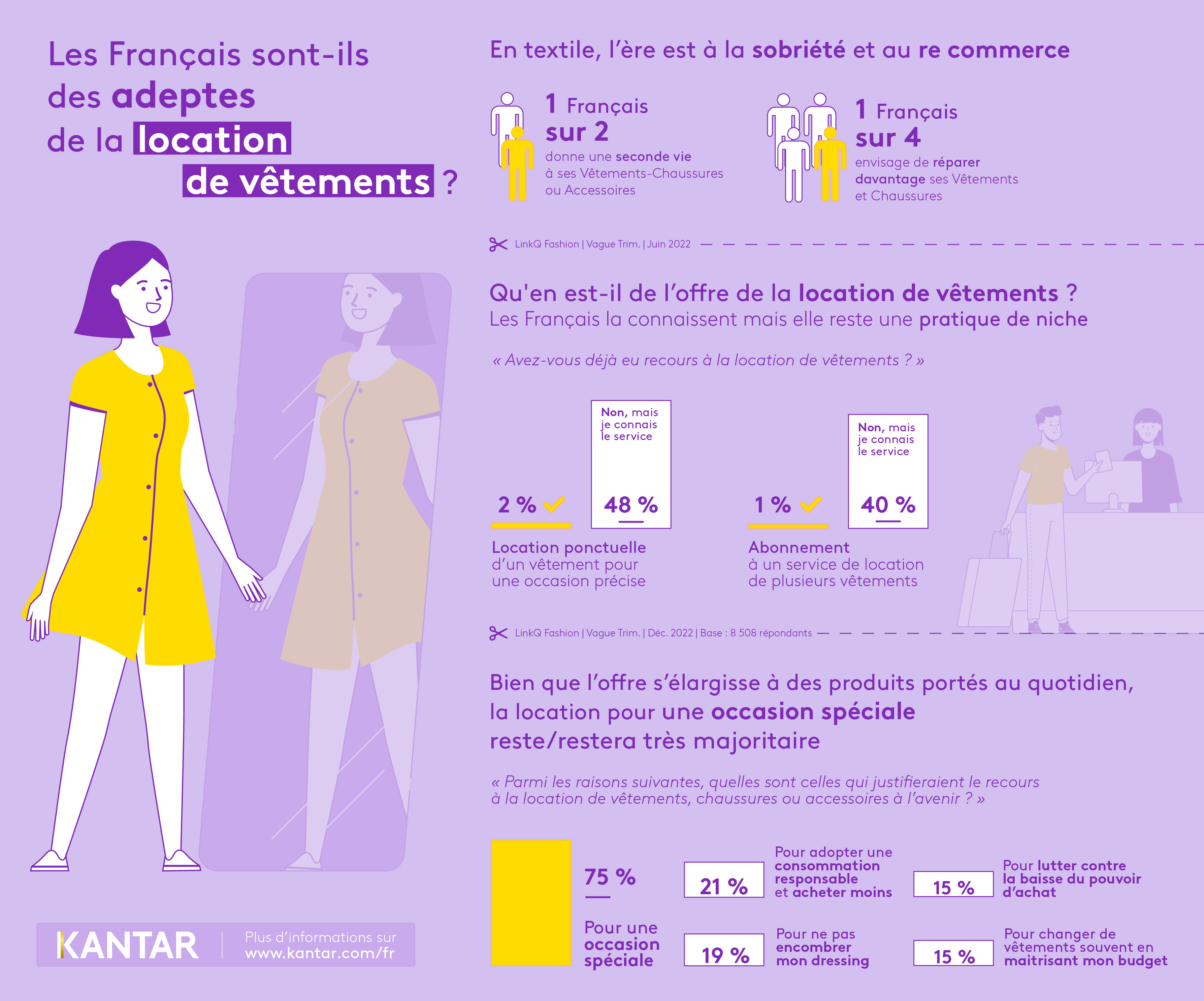 « La location de vêtements est une nouvelle manière d’adopter une consommation responsable car elle contribue à acheter moins tout en permettant de rallonger le cycle de vie des produits. Cette pratique est aussi synonyme de gain d’argent, de temps et de place dans les placards ! Si peu de consommateurs(rices) y ont aujourd’hui recours, le développement de l’offre ainsi que le marketing d’influence pourraient contribuer à démocratiser la pratique dans les années à venir.»