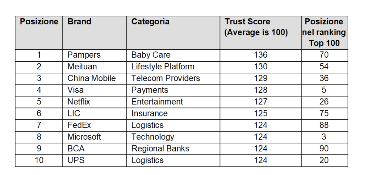 Il brand più affidabile secondo lo studio di BrandZ Global Top 100 di quest'anno è il brand statunitense Baby Care Pampers (n.70, 18,6 miliardi di dollari) con un punteggio nel Trust Score di 136 (con 100 come media) e un punteggio di oltre 120 in ogni mercato in cui viene misurato. Questo eccezionale livello di fiducia è dovuto principalmente alla sua percepita superiorità rispetto ai concorrenti e all’inarrestabile leadership tecnologica nella sua categoria.Al secondo posto si colloca il Brando cinese Meituan (n. 54, 23,9 miliardi di dollari), con un punteggio Trust di 130, che ha dimostrato di comprendere le esigenze dei consumatori e ha sviluppato una forte reputazione per il customer care. Tra i top 5 anche China Mobile (n. 36, 34,6 miliardi di dollari) ha totalizzato 129 nel Trust Score, Visa (n. 5, 186,8 miliardi di dollari) con 128 e Netflix (n. 26, 45,9 miliardi di dollari) con 127.Tra gli esempi nel nuovo ranking di altri brand che hanno rafforzato il loro livello di fiducia e responsabilità vi sono la banca indonesiana BCA (n. 90, 14,9 miliardi di dollari) che ha investito in tecnologia digitale per migliorare l'esperienza degli utenti e Coca-Cola (n. 13, 84,0 miliardi di dollari) che ha riorientato la sua potentissima rete di comunicazione per condividere informazioni utili durante l'epidemia di COVID-19.Questi brand evidenziano come la fiducia possa essere costruita con la giusta combinazione di Brand e Corporate Marketing, in qualsiasi parte del mondo e in qualsiasi categoria.