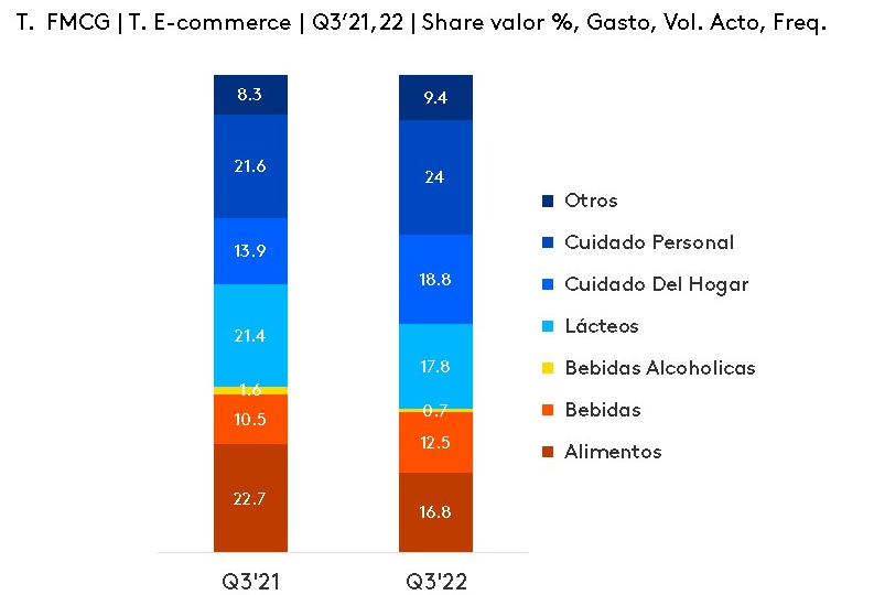 Otro aspecto para destacar es la fragmentación de los canales, factor clave en el cuidado del gasto. Ecommerce es aprovechado para productos de Cuidado del Hogar generando un gasto en Q3’21 de 13.9% y pasando a Q3’22 en 18.8%. En cuanto a los productos de higiene personal, evolucionó en Q3’21 de 21.6% a Q3’22 con 24%.