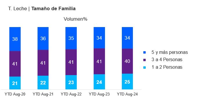 El menor consumo en la categoría de leches impacta a todos los grupos de hogares. Sin embargo, los hogares de 1 a 2 integrantes son los que mejor se sostienen e incluso ganan relevancia en el volumen de compra. En ese sentido, se observa que las compras de este grupo de hogares representaban el 21% del total de la categoría en el 2020, pero este año 2024 representa el 25%. Mientras que, el consumo de los hogares de 5 a más integrantes pasaron de representar el 38% al 34% en el mismo período.