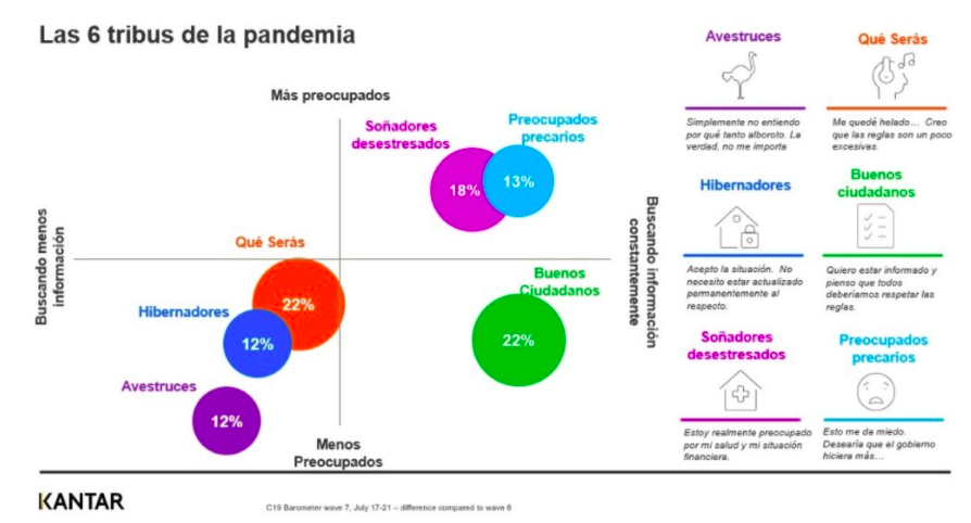 Vale destacar que esta clasificación por tribus es dinámica, tal como el contexto de pandemia. Se ha detectado que algunas han crecido en ciertos mercados. A nivel general, los “preocupados precarios” lo hicieron en un 2%; son los más ansiosos con la crisis y pendientes de las actualizaciones. Por otra parte, los “hibernadores” crecieron en un 1%; tribu que estaría en el lado opuesto de los anteriores porque son menos preocupados y no están pendientes de información actualizada sobre la pandemia. Mientras tanto, los “avestruces” y los “buenos ciudadanos” van en disminución, en un 1% cada uno.