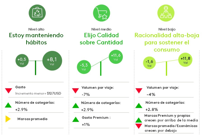 La clase media, sí muestra una priorización más acentuada: eligen calidad sobre cantidad. Es la que más reduce el volumen comprado en cada visita; al mismo tiempo, adquiere más categorías y su gasto en productos Premium crece levemente. Como resultado, el desembolso total de este NSE aumentó un 12% aun cuando el tamaño de los productos comprados cae un 5%, por lo que ellos representan el 50% de la caída del volumen de FMCG en Latam.