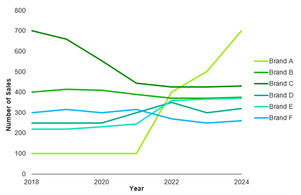 In the second chart, you can see that brand A has seen an increase in the number of sales since 2021 and is now at 700.