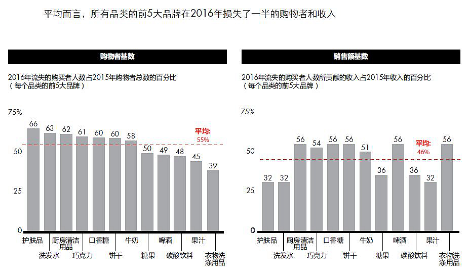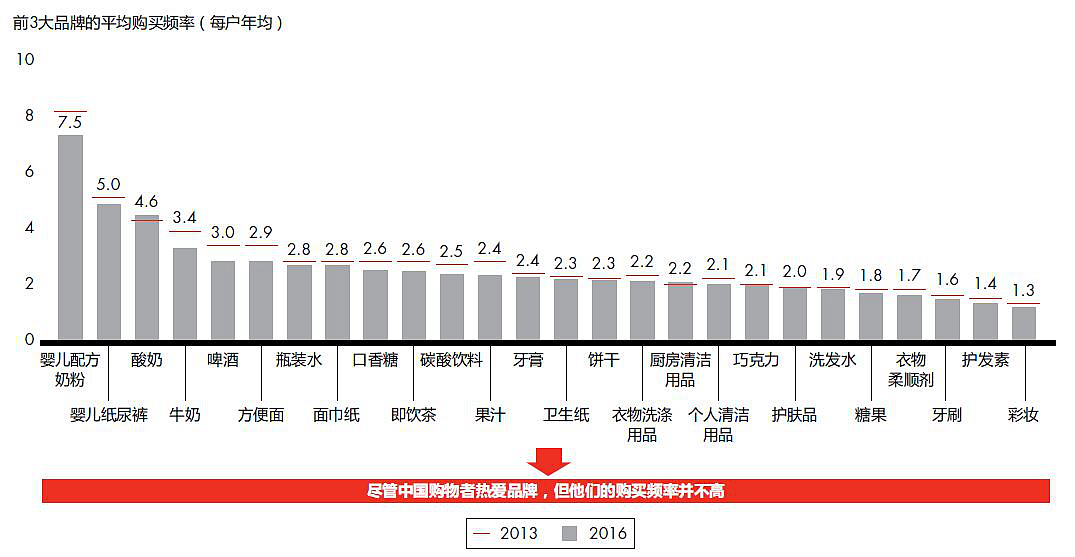 - 消费者对于品牌忠诚度非常低,即使是领先品牌的购买频率也非常低,从中就可以可见一斑(在大多数品类中,消费者每年购买领先品牌的频率不超过3次);