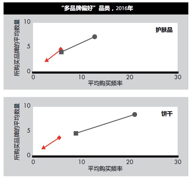 * 多品牌偏好的品类:消费者购买某品类产品的频率增加时,他们通常也倾向于尝试更多的品牌;